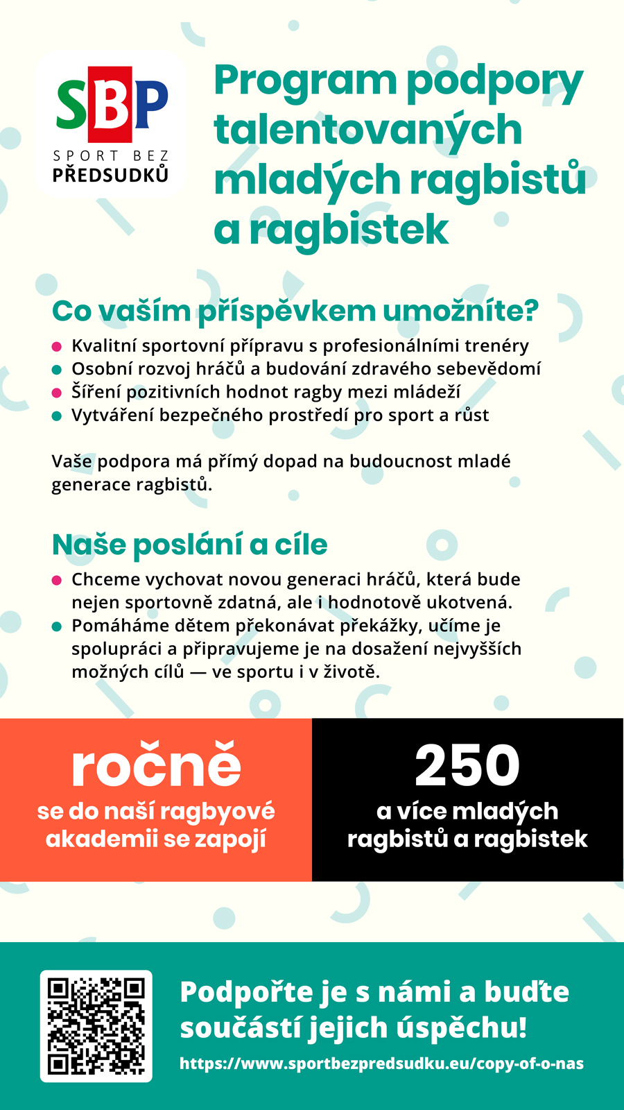 Každý rok věnujeme částku 100.000,- Kč potřebným mladým ragbistům, budeme rádi když naši aktivitu oceníte a třeba i drobnou částkou podpoříte dalšího mladého sportovce.